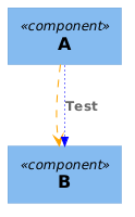 @startuml !include <C4/C4_Component> AddRelTag("DEF", $legendText="Java-Abhängigkeit", $lineColor = "#blue", $lineStyle = DottedLine()) Component(A, "A") Component(B, "B") A -[#orange,dashed]-> B Rel(A, B, "Test", $tags="DEF") @enduml