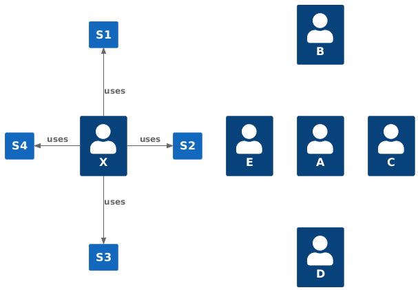 @startuml !include https://raw.githubusercontent.com/plantuml-stdlib/C4-PlantUML/master/C4_Container.puml HIDE_STEREOTYPE() Person(a, "A") Person(b, "B") Person(c, "C") Person(d, "D") Person(e, "E") Lay_U(a, b) Lay_R(a, c) Lay_D(a, d) Lay_L(a, e) Person(x, "X") System(s1, "S1") System(s2, "S2") System(s3, "S3") System(s4, "S4") Rel_U(x, s1, "uses") Rel_R(x, s2, "uses") Rel_D(x, s3, "uses") Rel_L(x, s4, "uses") @enduml