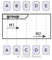 @startuml !pragma teoz true 'now works participant A participant B participant C participant D participant E group A->? : M1 ?->E : M2 end footer in %version() @enduml