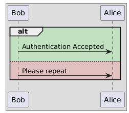 @startuml !pragma teoz true box participant Bob participant Alice end box alt #00ff0020 Bob -> Alice: Authentication Accepted else #ff000020 Bob -> Alice: Please repeat end @enduml