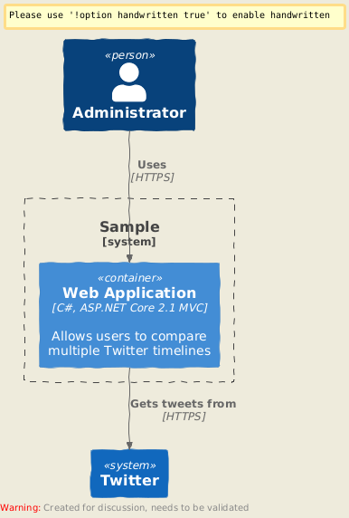 @startuml !include https://raw.githubusercontent.com/plantuml-stdlib/C4-PlantUML/master/C4_Container.puml LAYOUT_AS_SKETCH() Person(admin, "Administrator") System_Boundary(c1, 'Sample') { Container(web_app, "Web Application", "C#, ASP.NET Core 2.1 MVC", "Allows users to compare multiple Twitter timelines") } System(twitter, "Twitter") Rel(admin, web_app, "Uses", "HTTPS") Rel(web_app, twitter, "Gets tweets from", "HTTPS") @enduml