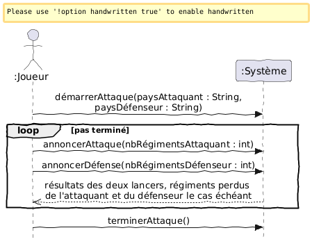 @startuml skinparam style strictuml skinparam backgroundcolor transparent skinparam defaultfontname xkcd Script skinparam handwritten true scale 1 skinparam sequenceMessageAlign center actor ":Joueur" as c participant ":Système" as s c->s : démarrerAttaque(paysAttaquant : String,\npaysDéfenseur : String) loop pas terminé c->s : annoncerAttaque(nbRégimentsAttaquant : int) c->s : annoncerDéfense(nbRégimentsDéfenseur : int) c<<--s : résultats des deux lancers, régiments perdus \nde l'attaquant et du défenseur le cas échéant end loop c->s : terminerAttaque() @enduml