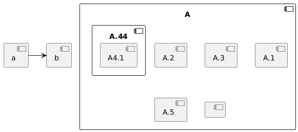 @startuml skinparam BackgroundColor transparent skinparam componentStyle uml2 component A { component "A.1" { } component A.44 { [A4.1] } component "A.2" [A.3] component A.5 [ A.5] component A.6 [ ] } [a]->[b] @enduml