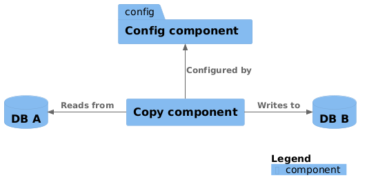 @startuml !ENABLE_ALL_PLANT_ELEMENTS = 1 !include https://raw.githubusercontent.com/plantuml-stdlib/C4-PlantUML/master/C4_Component.puml Component(comp, "Copy component") Component(config, "Config component", $baseShape="package") ComponentDb(dbA, "DB A") ' alternative syntax for ComponentDb() with $baseShape="database" Component(dbB, "DB B", $baseShape="database") Rel_U(comp, config, "Configured by") Rel_L(comp, dbA, "Reads from") Rel_R(comp, dbB, "Writes to") SHOW_LEGEND() @enduml