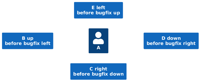 @startuml ' the bugfix is deactivated with following statement !NO_LAY_ROTATE = 1 !include https://raw.githubusercontent.com/plantuml-stdlib/C4-PlantUML/master/C4_Container.puml LAYOUT_LANDSCAPE() Person(a, "A") System(sUp, "B up\nbefore bugfix left") System(sRight, "C right\nbefore bugfix down") System(sDown, "D down\nbefore bugfix right") System(sLeft, "E left\nbefore bugfix up") Lay_U(a, sUp) Lay_R(a, sRight) Lay_D(a, sDown) Lay_L(a, sLeft) HIDE_STEREOTYPE() @enduml