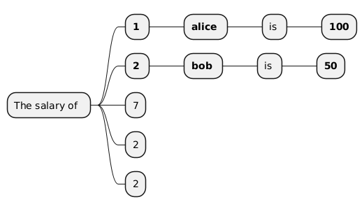 @startmindmap !$foo = { "company": "Skynet", "employees" : [ {"name" : "alice", "salary": 100 }, {"name" : "bob", "salary": 50} ] } !$index=1 * The salary of !foreach $emp in $foo.employees ** **$index** *** **$emp.name** **** is ***** **$emp.salary** !$index = $index+1 !endfor ** %size("company") ** %size($foo.employees) ** %size($foo) @endmindmap