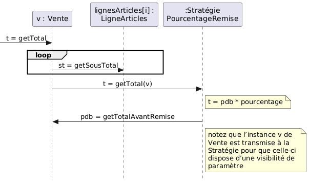 @startuml skinparam style strictuml skinparam backgroundcolor transparent skinparam defaultFontName Arial Unicode MS skinparam sequenceMessageAlign center participant "v : Vente" as v participant "lignesArticles[i] :\nLigneArticles" as la participant ":Stratégie\nPourcentageRemise" as s -> v : t = getTotal loop v -> la : st = getSousTotal end loop v -> s : t = getTotal(v) note right of s t = pdb * pourcentage end note s -> v : pdb = getTotalAvantRemise note right of s notez que l’instance v de Vente est transmise à la Stratégie pour que celle-ci dispose d’une visibilité de paramètre end note @enduml