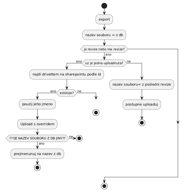 @startuml start :export; :nazev souboru = z db; if (je revize nebo ma revize?) then (ano) if (uz je jedna uploadnuta?) then (ano) :najdi driveItem na sharepointu podle id; if (existuje?) then (ano) :pouzij jeho jmeno; :Upload s overridem; if (???JE NAZEV SOUBORU Z DB JINY??) then (ne) stop else (ano) :prejmenunuj na nazev z db; stop endif else (ne) goto uploadRevize stop endif else (ne) label uploadRevize :nazev souboru= z posledni revize; :postupne uploaduj; stop endif endif stop @enduml
