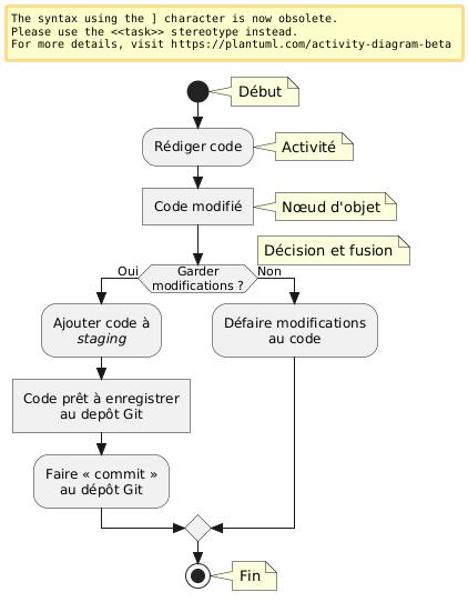 @startuml skinparam style strictuml skinparam defaultFontName Helvetica,Arial,sans-serif skinparam backgroundcolor transparent skinparam DefaultTextAlignment center start note right : Début :Rédiger code; note right : Activité :Code modifié] note right : Nœud d'objet if (Garder\nmodifications ?) then (Oui) note right : Décision et fusion :Ajouter code à //staging//; :Code prêt à enregistrer au depôt Git] :Faire « commit » au dépôt Git; else (Non) :Défaire modifications au code; endif stop note right : Fin @enduml