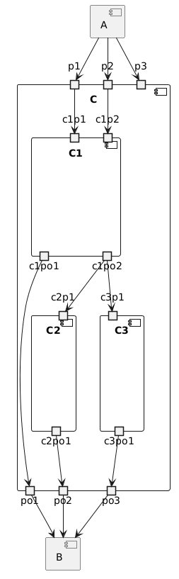 @startuml 'left to right direction [A] component C { portin p1 portin p2 portin p3 portout po1 portout po2 portout po3 component C1 { portin c1p1 portin c1p2 portout c1po1 portout c1po2 } component C2 { portin c2p1 portout c2po1 } component C3 { portin c3p1 portout c3po1 } } [B] A --> p1 A --> p2 A --> p3 p1 --> c1p1 p2 --> c1p2 po1 --> B po2 --> B po3 --> B c1po1 --> po1 c1po2 --> c2p1 c1po2 --> c3p1 c2po1 --> po2 c3po1 --> po3 @enduml