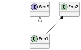 @startuml interface IBar interface Foo3 class Foo1 implements IBar, Foo3 class Foo2 Foo2 *-- Foo1 ' the following can be loaded via !include hide IBar @enduml
