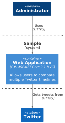 @startuml !include https://raw.githubusercontent.com/plantuml-stdlib/C4-PlantUML/master/C4_Container.puml HIDE_PERSON_SPRITE() Person(admin, "Administrator") System_Boundary(c1, 'Sample') { Container(web_app, "Web Application", "C#, ASP.NET Core 2.1 MVC", "Allows users to compare multiple Twitter timelines") } System(twitter, "Twitter") Rel(admin, web_app, "Uses", "HTTPS") Rel(web_app, twitter, "Gets tweets from", "HTTPS") @enduml
