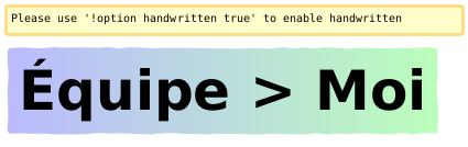 @startuml skinparam style strictuml skinparam backgroundcolor transparent skinparam defaultfontname xkcd Script skinparam handwritten true skinparam rectangleBorderColor transparent hide empty members hide circle skinparam shadowing false rectangle "<size:50>**Équipe > Moi**</size>" #bbbbff|bbffbb @enduml