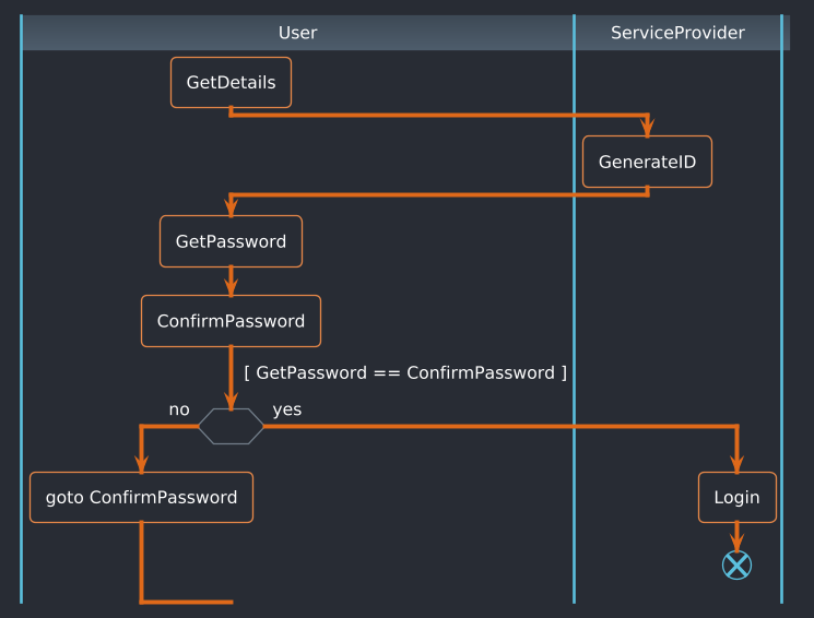 @startuml !theme superhero-outline skinparam dpi 125 skinparam backgroundColor #282c34 skinparam defaultFontColor #ffffff |User| :GetDetails; |ServiceProvider| :GenerateID; |User| :GetPassword; :ConfirmPassword; -> [ GetPassword == ConfirmPassword ]; if () then (no) |User| :goto ConfirmPassword; else (yes) |ServiceProvider| :Login; end @enduml