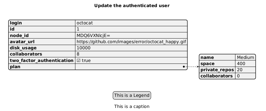 @startuml Title Update the authenticated user Caption This is a caption Legend This is a Legend skinparam wrapWidth 800 label B [ {{json { "login": "octocat", "id": 1, "node_id": "MDQ6VXNlcjE=", "avatar_url": "https://github.com/images/error/octocat_happy.gif", "disk_usage": 10000, "collaborators": 8, "two_factor_authentication": true, "plan": { "name": "Medium", "space": 400, "private_repos": 20, "collaborators": 0 } } }} ] @enduml