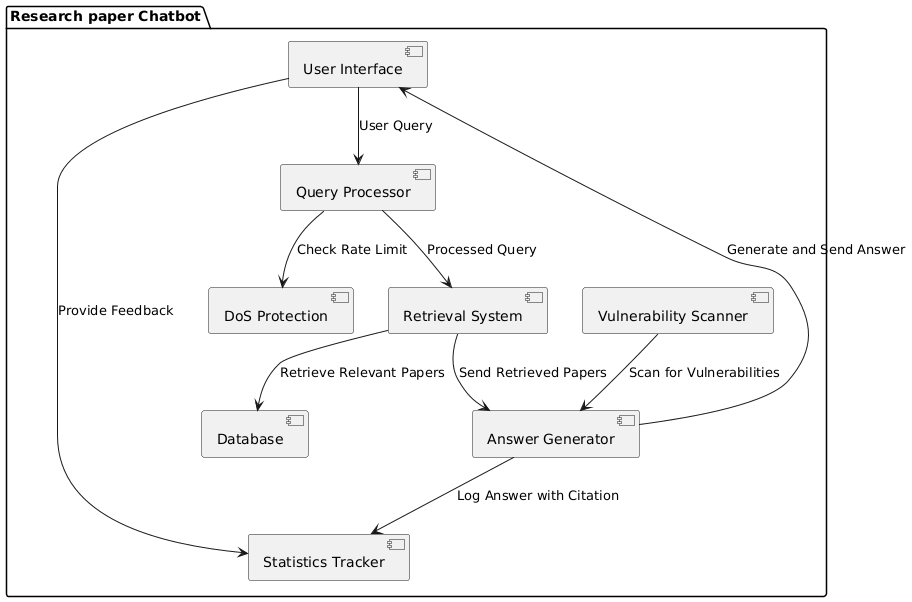 @startuml package "Research paper Chatbot" { component "User Interface" as UI component "Query Processor" as QP component "Retrieval System" as RS component "Answer Generator" as AG component "Database" as DB component "Statistics Tracker" as ST component "DoS Protection" as DOP component "Vulnerability Scanner" as VS UI --> QP : User Query QP --> RS : Processed Query RS --> DB : Retrieve Relevant Papers RS --> AG : Send Retrieved Papers AG --> UI : Generate and Send Answer AG --> ST : Log Answer with Citation UI --> ST : Provide Feedback QP --> DOP : Check Rate Limit VS --> AG : Scan for Vulnerabilities } @enduml