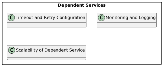 @startuml skinparam packageStyle rectangle skinparam linetype ortho package "Dependent Services" { class "Timeout and Retry Configuration" class "Monitoring and Logging" class "Scalability of Dependent Service" } @enduml