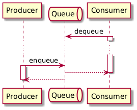 @startuml skin rose participant Producer queue Queue Consumer->Queue : dequeue activate Consumer ... Producer->Queue : enqueue activate Producer Queue-->Consumer deactivate Consumer Queue-->Producer deactivate Producer @enduml