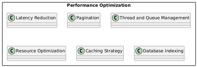 @startuml skinparam packageStyle rectangle skinparam linetype ortho package "Performance Optimization" { class "Latency Reduction" class "Pagination" class "Thread and Queue Management" class "Resource Optimization" class "Caching Strategy" class "Database Indexing" } @enduml