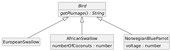 @startuml skinparam style strictuml skinparam defaultFontName Helvetica,Arial,sans-serif skinparam backgroundcolor transparent hide empty members abstract Bird { {abstract} getPlumage() : String } class EuropeanSwallow extends Bird class AfricanSwallow extends Bird { numberOfCoconuts : number } class NorwegianBlueParrot extends Bird { voltage : number } @enduml