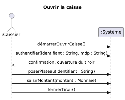 @startuml skinparam style strictuml skinparam defaultFontName Helvetica,Arial,sans-serif skinparam backgroundcolor transparent skinparam SequenceMessageAlign center title Ouvrir la caisse actor ":Caissier" as C participant ":Système" as S C->S: démarrerOuvrirCaisse() C->S: authentifier(identifiant : String, mdp : String) C<<--S: confirmation, ouverture du tiroir C->S: poserPlateau(identifiant : String) C->S: saisirMontant(montant : Monnaie) C->S: fermerTiroir() @enduml