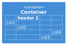 @startuml !include https://raw.githubusercontent.com/plantuml-stdlib/C4-PlantUML/master/C4_Container.puml ' at b) header has only 2 columns, therefore col3 is not displayed SetPropertyHeader("", $col2Name="header 2") AddProperty($col1="col1") AddProperty("", $col2="col2") AddProperty(" ", " ", "", $col4="col4") ' at a) col3 is displayed in column 2 and not 3 AddProperty("", $col3="col3") Container(c, "Container") @enduml