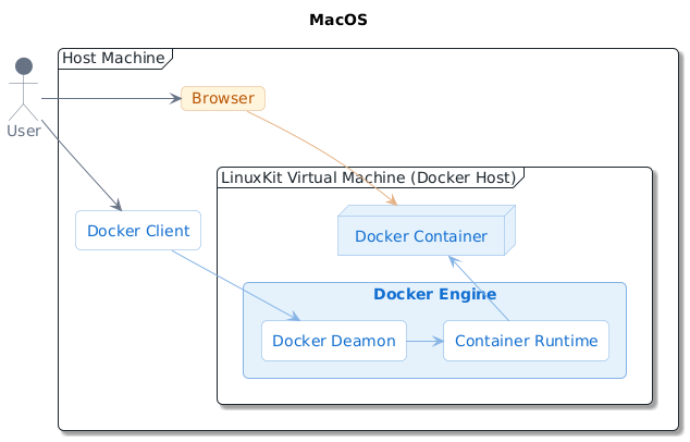 @startuml !include https://gist.pother.ca/de8ec1f582e3b7ba1cc629820d026c84/styles.iuml title "MacOS" actor User as user frame "Host Machine" as host { card Browser as client agent "Docker Client" as docker frame "LinuxKit Virtual Machine (Docker Host)" { rectangle "Docker Engine" as api { agent "Docker Deamon" as dockerd agent "Container Runtime" as containerd } node "Docker Container" as container } } user -> docker $color.gray user -> client $color.gray docker --> dockerd dockerd -> containerd containerd -u-> container client -d-> container $color.yellow @enduml