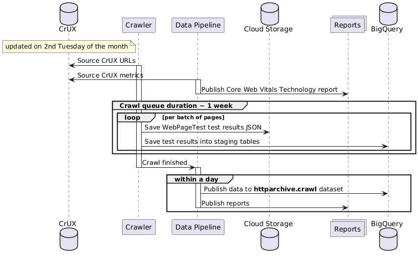@startuml database CrUX participant Crawler participant Pipeline as "Data Pipeline" database CloudStorage as "Cloud Storage" collections Reports database BigQuery Note over CrUX: updated on 2nd Tuesday of the month Crawler->CrUX: Source CrUX URLs activate Crawler Pipeline->CrUX: Source CrUX metrics activate Pipeline Pipeline->Reports: Publish Core Web Vitals Technology report deactivate Pipeline group Crawl queue duration ~ 1 week loop per batch of pages Crawler->CloudStorage: Save WebPageTest test results JSON Crawler->BigQuery: Save test results into staging tables end end Crawler->Pipeline : Crawl finished deactivate Crawler group within a day activate Pipeline Pipeline->BigQuery: Publish data to **httparchive.crawl** dataset Pipeline->Reports: Publish reports deactivate Pipeline end @enduml