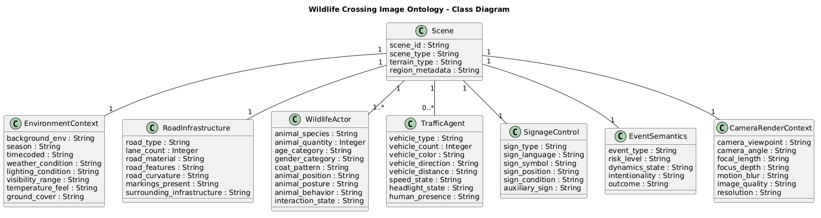 @startuml title Wildlife Crossing Image Ontology - Class Diagram ' Styling (optional but helps match the look) skinparam classAttributeIconSize 0 skinparam shadowing false skinparam roundcorner 6 class Scene { scene_id : String scene_type : String terrain_type : String region_metadata : String } class EnvironmentContext { background_env : String season : String timecoded : String weather_condition : String lighting_condition : String visibility_range : String temperature_feel : String ground_cover : String } class RoadInfrastructure { road_type : String lane_count : Integer road_material : String road_features : String road_curvature : String markings_present : String surrounding_infrastructure : String } class WildlifeActor { animal_species : String animal_quantity : Integer age_category : String gender_category : String coat_pattern : String animal_position : String animal_posture : String animal_behavior : String interaction_state : String } class TrafficAgent { vehicle_type : String vehicle_count : Integer vehicle_color : String vehicle_direction : String vehicle_distance : String speed_state : String headlight_state : String human_presence : String } class SignageControl { sign_type : String sign_language : String sign_symbol : String sign_position : String sign_condition : String auxiliary_sign : String } class EventSemantics { event_type : String risk_level : String dynamics_state : String intentionality : String outcome : String } class CameraRenderContext { camera_viewpoint : String camera_angle : String focal_length : String focus_depth : String motion_blur : String image_quality : String resolution : String } ' Associations and multiplicities (as in the diagram) Scene "1" -- "1" EnvironmentContext Scene "1" -- "1" RoadInfrastructure Scene "1" -- "1..*" WildlifeActor Scene "1" -- "0..*" TrafficAgent Scene "1" -- "1" SignageControl Scene "1" -- "1" EventSemantics Scene "1" -- "1" CameraRenderContext @enduml