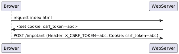 @startuml participant Brower as b participant WebServer as s b -> s: request index.html s -> b: <set cookie: csrf_token=abc> b -> s: POST /impotant (Header: X_CSRF_TOKEN=abc, Cookie: csrf_token=abc) @enduml