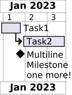 @startgantt skinparam dpi 250 projectscale weekly Project starts 2023-01-01 [Task1] starts 2023-01-01 and lasts 1 week [Task2] starts after [Task1]'s end and lasts 2 weeks [Multiline\nMilestone\none more!] happens after [Task1]'s end @endgantt