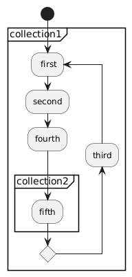 @startuml start group collection1 { repeat : first; :second; backward :third; ' closing "}" here causes problems :fourth; group collection2 :fifth; } ' closing "}" here also causes problems @enduml