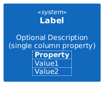 @startuml !include https://raw.githubusercontent.com/plantuml-stdlib/C4-PlantUML/master/C4_Deployment.puml SetPropertyHeader("Property") AddProperty("Value1") AddProperty("Value2") System(systemAlias, "Label", "Optional Description\n(single column property)") @enduml