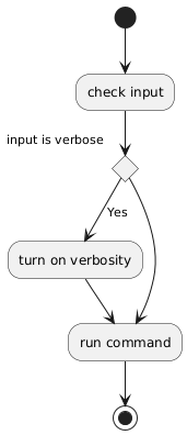 @startuml (*) --> "check input" If "input is verbose" then --> [Yes] "turn on verbosity" --> "run command" else --> "run command" Endif -->(*) @enduml