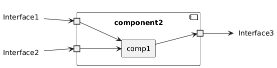 @startuml left to right direction component "component2" { portin " " as pi2 portin " " as pi1 portout " " as po1 rectangle comp1 pi1 -> comp1 pi2 -> comp1 comp1 -> po1 } label "Interface2" as I2 label "Interface1" as I1 label "Interface3" as O3 pi2 <-u- I2 pi1 <-u- I1 po1 --> O3 @enduml