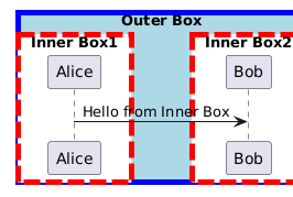 @startuml !pragma teoz true <style> box { LineColor blue BackgroundColor lightblue LineThickness 5 .red { LineColor red BackgroundColor #white LineStyle 15-5 } } </style> box "Outer Box" box "Inner Box1" <<red>> participant Alice end box box "Inner Box2" <<red>> participant Bob Alice -> Bob : Hello from Inner Box end box end box @enduml