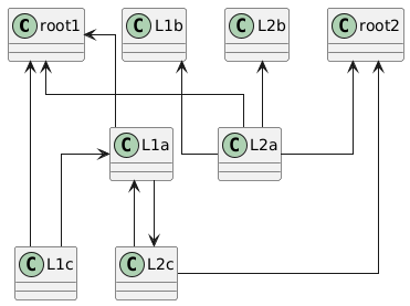 @startuml skinparam linetype ortho class root1 class root2 class L1a class L1b class L1c class L2a class L2b class L2c root1 <-- L1a root1 <-- L1c root1 <-- L2a root2 <-- L2a root2 <-- L2c L1b <-- L2a L2b <-- L2a L1a <-- L2c L1a <-- L1c L2c <-- L1a @enduml