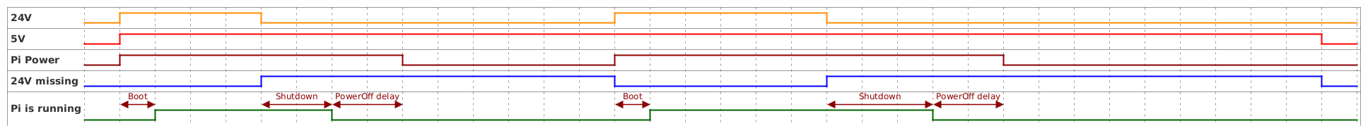 @startuml <style> timingDiagram { .red { LineColor red } .yellow { LineColor darkorange } .darkred { LineColor darkred } .blue { LineColor blue } } </style> hide time-axis binary "24V" as V24 <<yellow>> binary "5V" as V5 <<red>> binary "Pi Power" as PiPower <<darkred>> binary "24V missing" as Missing24 <<blue>> binary "Pi is running" as Running @0 V24 is low V5 is low @100 V24 is high V5 is high PiPower is high @200 Running is high @500 V24 is low V5 is high Missing24 is high @700 Running is low @900 PiPower is low @1500 V24 is high PiPower is high Missing24 is low @1600 Running is high @2100 V24 is low Missing24 is high @2400 Running is low @2600 PiPower is low @3500 V5 is low Missing24 is low @Running @100 <-> @200 : Boot @500 <-> @700 : Shutdown @700 <-> @900 : PowerOff delay @1500 <-> @1600 : Boot @2100 <-> @2400 : Shutdown @2400 <-> @2600 : PowerOff delay @enduml