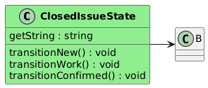 @startuml class "<B>ClosedIssueState</B>" as ClosedIssueState #lightgreen { getString : string transitionNew() : void transitionWork() : void transitionConfirmed() : void } ClosedIssueState -> B @enduml