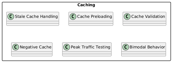 @startuml skinparam packageStyle rectangle skinparam linetype ortho package "Caching" { class "Stale Cache Handling" class "Cache Preloading" class "Cache Validation" class "Negative Cache" class "Peak Traffic Testing" class "Bimodal Behavior" } @enduml