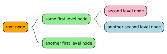 @startmindmap *[#Orange] root node *[#lightgreen] some first level node *[#FFBBCC] second level node *[#lightblue] another second level node *[#lightgreen] another first level node @endmindmap