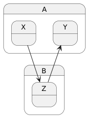 @startuml state A { state X { } state Y { } } state B { state Z { } } X --> Z Z --> Y @enduml