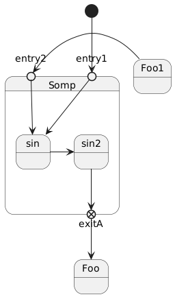 @startuml state Somp { state entry1 <<entryPoint>> state entry2 <<entryPoint>> state sin entry1 --> sin entry2 -> sin sin -> sin2 sin2 --> exitA <<exitPoint>> } [*] --> entry1 exitA --> Foo Foo1 -> entry2 @enduml