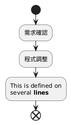 @startuml start :需求確認; :程式調整; :This is defined on several **lines**; end @enduml