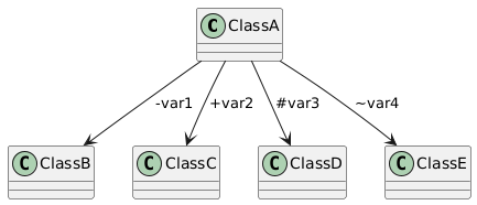 @startuml skinparam classAttributeIconSize 0 class ClassA class ClassB class ClassC class ClassD class ClassE ClassA --> ClassB : -var1 ClassA --> ClassC : +var2 ClassA --> ClassD : #var3 ClassA --> ClassE : ~var4 @enduml