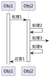 @startuml activate Obj1 Obj1 -> Obj2 : 処理1 activate Obj2 Obj2 ->Obj2 :処理2 Obj2 ->] :処理3 Obj2 ->Obj2 :処理4 Obj2 -->Obj1 :応答1 deactivate Obj2 @enduml