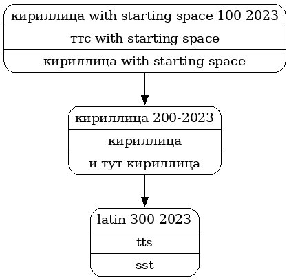 @startuml digraph cyrillic { node [shape = Mrecord] node [label = "{ | | }"] 100 [label = "{кириллица with starting space \N-2023| ттс with starting space | кириллица with starting space}"] 200 [label = "{кириллица \N-2023|кириллица|и тут кириллица}"] 300 [label = "{latin \N-2023|tts|sst}"] 100 -> 200 -> 300 } @enduml