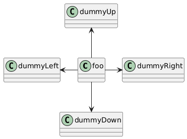 @startuml foo -left-> dummyLeft foo -right-> dummyRight foo -up-> dummyUp foo -down-> dummyDown @enduml