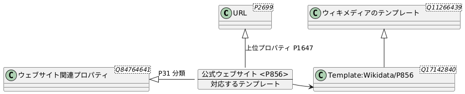 @startuml class "URL <P2699>" as URL class "ウェブサイト関連プロパティ <Q84764641>" as Q84764641 class "Template:Wikidata/P856 <Q17142840>" as Q17142840 { } class "ウィキメディアのテンプレート <Q11266439>" as TemplateWikimedia { } map "公式ウェブサイト <P856>" as P856 { 対応するテンプレート => Template:Official website, 対応するテンプレート => Template:Official URL, 対応するテンプレート *-> Q17142840 } URL <|-- P856 : 上位プロパティ P1647 Q84764641 <|- P856 : P31 分類 TemplateWikimedia <|-- Q17142840 @enduml