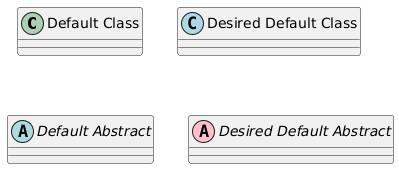 @startuml class "Default Class" class "Desired Default Class" << (C,LightBlue) >> abstract "Default Abstract" abstract "Desired Default Abstract" << (A,Pink) >> @enduml